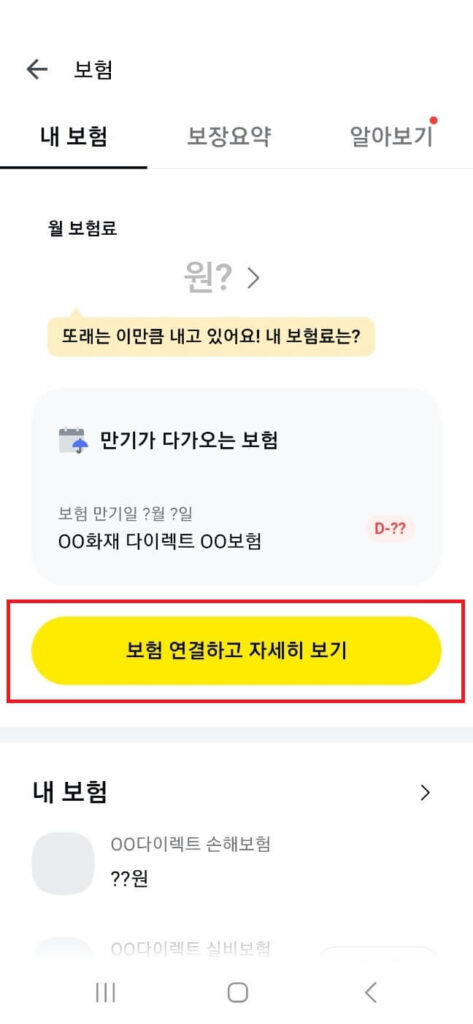 1. [카카오톡]-[더보기]-[카카오페이]-[보험] or [카카오페이 어플 접속]-[전체보기]-[보험 메뉴]-[내 보험]