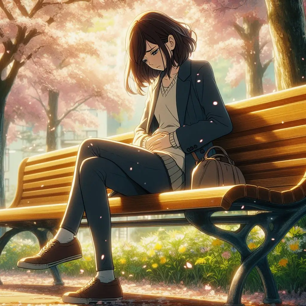 벤치에 앉아서 복통을 느끼는 여성